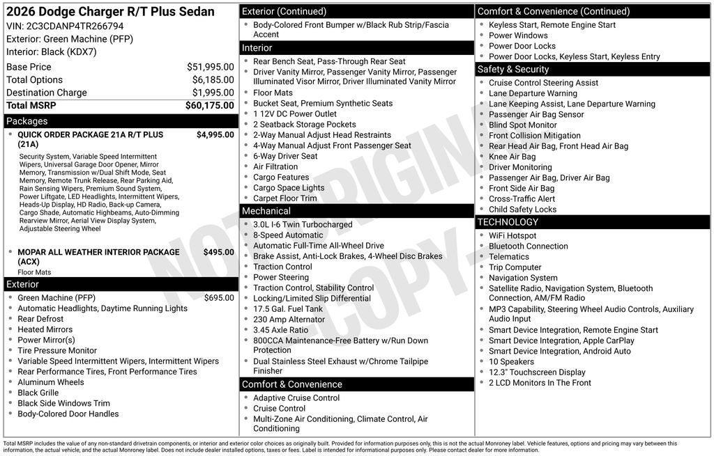 2026 Dodge Charger R/T in Green Machine vehicle highlights include.., AUTOMATIC, QUALITY, AWD, Black Premium Synthetic.