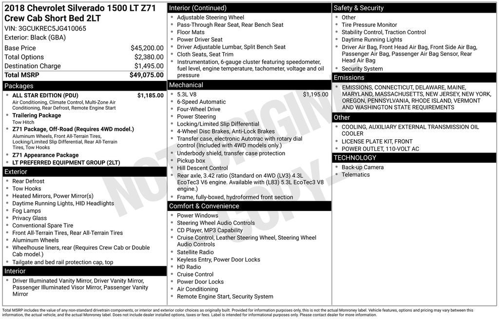 - Z71 Package, Off-Road (Requires 4WD model.), includes monotube Rancho brand shocks, (K47) air cleaner, (JHD) Hill Descent Control, (NZZ) underbody shield and (V76) recovery hooks. Also includes brushed metal Z71 door sill plate, unique Z71 gauge cluster, unique finish interior trim plates, unique lower bumper appearance, unique grille design with Z71 badge and Z71 pickup box decals (Includes (Z82) Trailering Package, (G80) locking rear differential and (RD1) 18" bright machined wheels and (RBX) 18" tires. Upgradeable to (RD4) 20" polished-aluminum wheels or 22" LPO wheels. (RD1) 18" bright machined wheels will be replaced with (RX1) 22" LPO wheels when (PDD) Local Market Package (Double Cab), LPO or (PDD) Local Market Package (Crew Cab), LPO is ordered.)