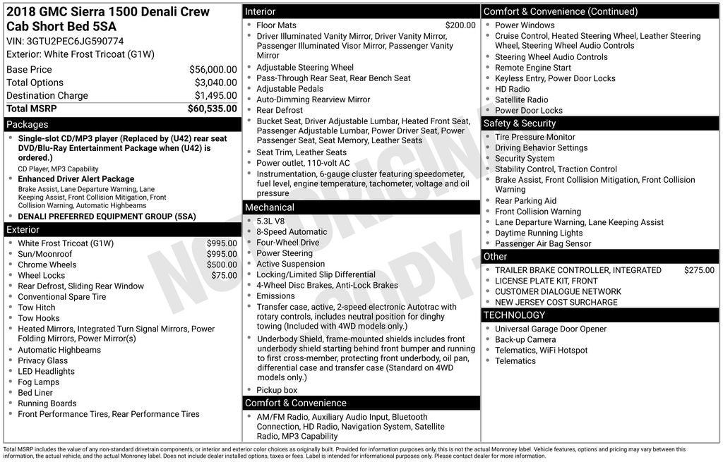 2018 GMC Sierra 1500 Denali in White Frost Tricoat vehicle highlights include.., FORD BLUE CPO, CLEAN CAR FAX, 4WD, NAVIGATION, FORWARD & REVERSE SENSING SYSTEM, REAR VIEW CAMERA w /REVERSE SENSING, FRONT & REAR SONAR, DUAL AC, REMOTE KEYLESS ENTRY, ILLUMINATED ENTRY, AUTOMATIC, HEATED STEERING WHEEL, POWERED ADJUSTABLE PEDALS w/MEMORY, WIRELESS CHARGING PAD, ON-STAR*, PREMIUM FOG LIGHTS, INTEGRATED TRAILER BRAKE, POWER SLIDING REAR WINDOW w/DEFROST, REAR STEP BUMPER, QUALITY, PREMIUM LEATHER TRIMMED SEATING, MEMORY DRIVER SEAT, POWER SEATS, SPORT SEATS, HEATED & COOLED FRONT SEATS, VENTILATED SEATS, AUTOMATIC HEADLIGHTS, 8-Speed Automatic with Overdrive, 4WD, Cocoa/Dark Sand Leather, 3.42 Rear Axle Ratio, Alloy wheels, Auto High-beam Headlights, Deep-Tinted Glass, Delay-off headlights, Front Center Armrest w/Storage, Front fog lights, Front Frame-Mounted Black Recovery Hooks, Fully automatic headlights, GMC Connected Access, Heated & Ventilated Front Bucket Seats, Heated steering wheel, Illuminated entry, Integrated Trailer Brake Controller, Lane Keep Assist, Low Speed Forward Automatic Braking, OnStar & GMC Connected Services Capable, Outside temperature display, Overhead console, Passenger vanity mirror, Perforated Leather Appointed Seat Trim, Power Adjustable Pedals, Power passenger seat, Power Sliding Rear Window w/Defogger, Rear 60/40 Folding Bench Seat (Folds Up), Rear reading lights, Rear seat center armrest, Split folding rear seat, Tachometer, Ultrasonic Front & Rear Park Assist, Voltmeter, Wheel Locks (Set of 4) (LPO), Wheels: 20 x 9 Chrome (4), Wireless Charging.