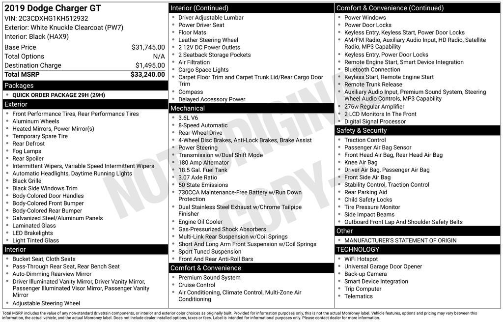 2019 Dodge Charger GT in White Knuckle Clearcoat vehicle highlights include.., FORD BLUE CPO, RWD, PARKSENSE REAR PARK ASSIST, PARKVIEW BACK UP CAMERA, DUAL AC, REMOTE START, KEYLESS GO>>, REMOTE KEYLESS ENTRY, ILLUMINATED ENTRY, AUTOMATIC, APPLE CAR PLAY/ANDROID AUTO, BRIGHT SPORT PEDAL, ELECTRIC PARK BRAKE, FUNCTIONAL HOOD SCOOP, REAR SPOILER, SPORT MODE, 4G WIFI MODEM, WIFI HOT SPOT, INTEGRATED VOICE CONTROL, UCONNECT, PROJECTOR FOG LIGHTS, QUALITY, HALOGEN HEADLIGHTS, CAPLESS FUEL EZ FILL, DUAL EXHAUST w/BRIGHT TIPS, PERFORMANCE SUSPENSION, GT BADGING, Black Cloth, 9 Premium Alpine Speakers, ABS brakes, Alloy wheels, AM/FM radio: SiriusXM, Anti-whiplash front head restraints, Apple CarPlay/Android Auto, Auto-dimming Rear-View mirror, Automatic temperature control, Brake assist, Cloth Performance Seats, Compass, Delay-off headlights, Driver vanity mirror, Dual front side impact airbags, Electronic Stability Control, Emergency communication system: SiriusXM Guardian, Four wheel independent suspension, Front Bucket Seats, Front Center Armrest, Front dual zone A/C, Front fog lights, Fully automatic headlights, Heated door mirrors, Low tire pressure warning, Panic alarm, ParkView Rear Back-Up Camera, Power 4-Way Driver Lumbar Adjust, Power door mirrors, Power driver seat, Power steering, Power windows, Radio data system, Radio: Uconnect 4C w/8.4 Display, Rear anti-roll bar, Rear Armrest w/Cupholder Seat, Rear window defroster, Remote keyless entry, Split folding rear seat, Steering wheel mounted audio controls, Tachometer, Traction control, Trip computer, Variably intermittent wipers, Wheels: 20 x 8.0 Granite Crystal Aluminum.